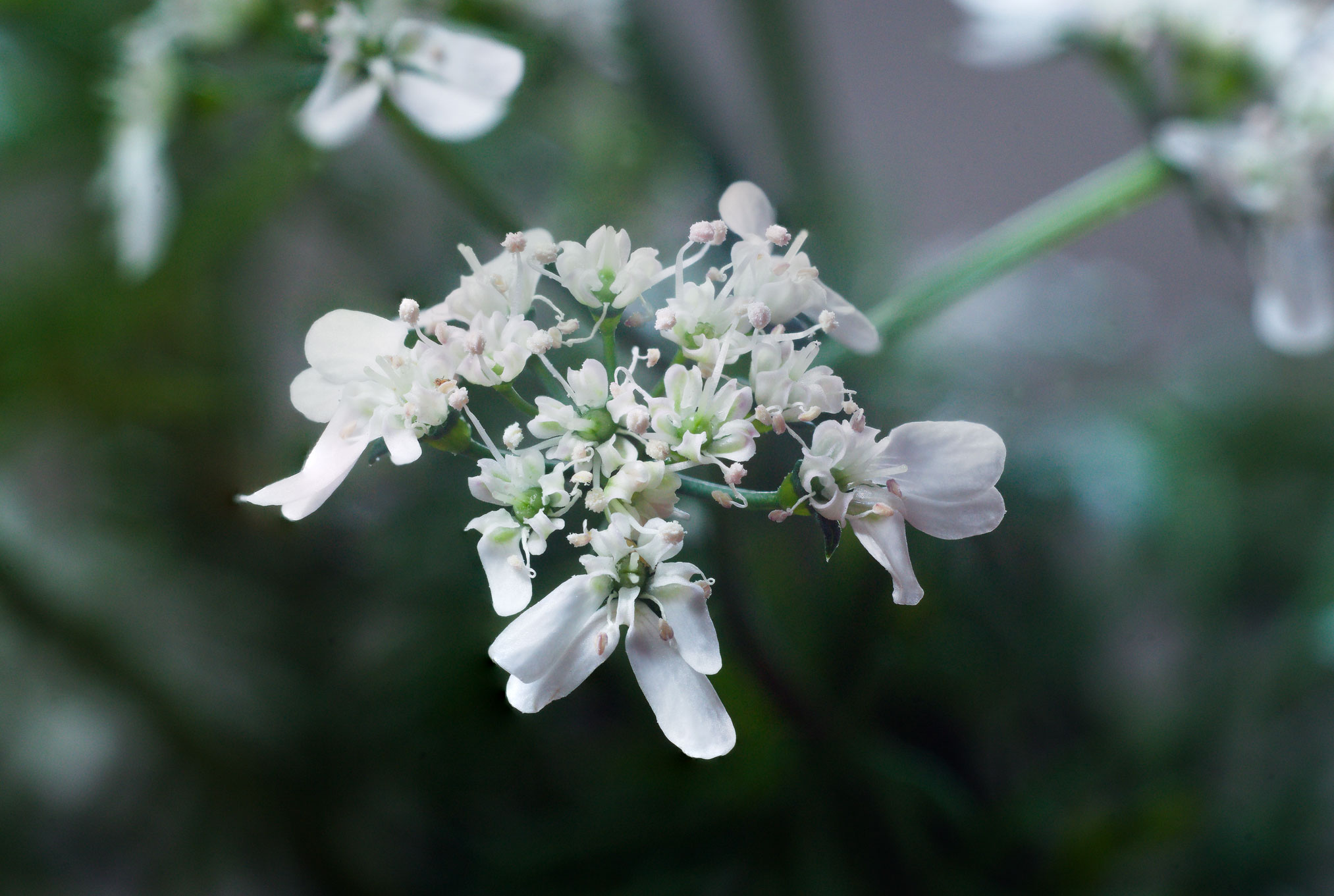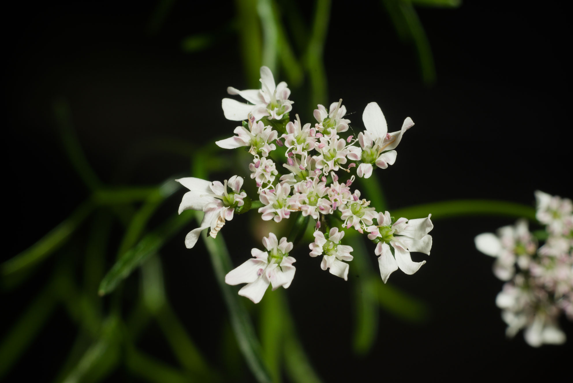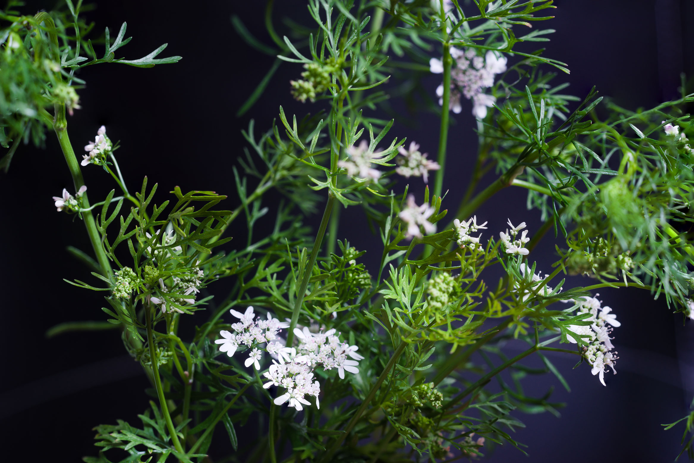 Coriander is an annual herb cultivated for its leaves and seeds, which serve diverse culinary and medicinal purposes. It grows to a height of 1 to 2 feet (0.3 to 0.6 meters), forming slender, green stems topped with delicate, lacy leaves. The plant’s lower leaves are broad and lobed, while the upper leaves are finely dissected. Coriander blooms with small, white to pale pink flowers arranged in flat-topped clusters called umbels, followed by round, aromatic seeds.
