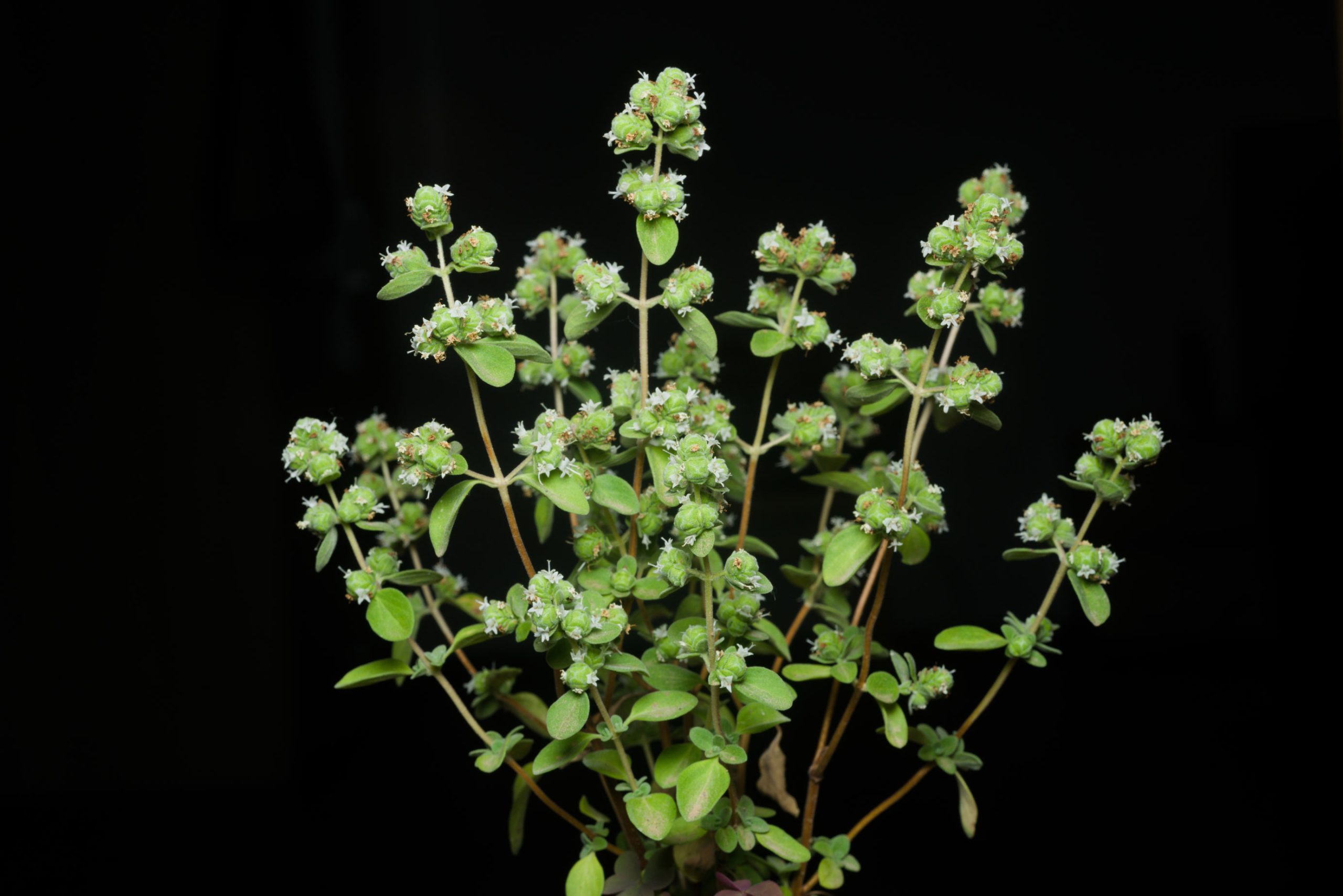 | Identification | Height: 1 to 2 feet (0.3 to 0.6 meters) Leaves: Small, oval-shaped, velvety, pale green, aromatic Stem: Slender, branching, and woody at the base Flowers: Tiny white or pink blooms in clusters Roots: Shallow and fibrous Growth Habit: Low-growing, bushy form |
