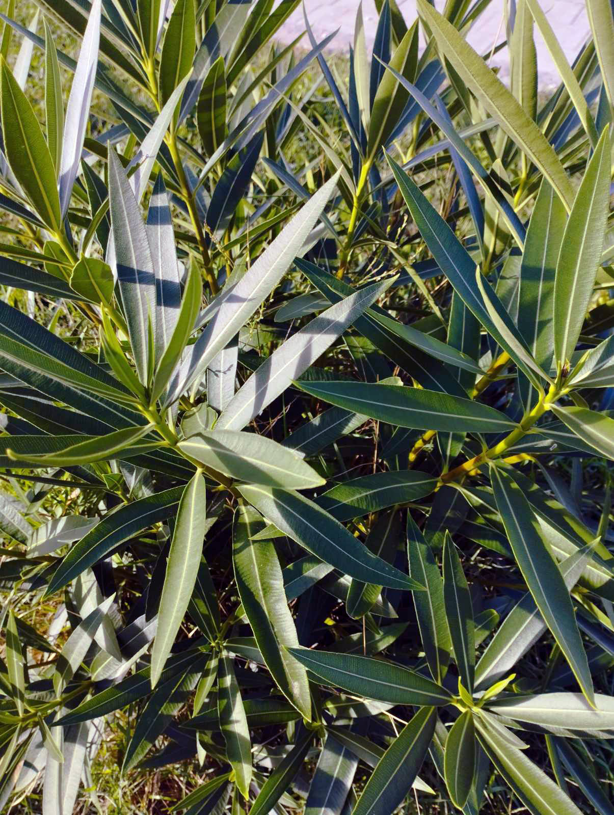 | Identification | Height: 6 to 20 feet (1.8 to 6 meters) Leaves: Long, leathery, dark green, lance-shaped Stem: Woody, upright Flowers: Pink, white, red, or yellow; clustered, 5-petaled, fragrant Roots: Deep and fibrous Growth Habit: Upright, bushy |